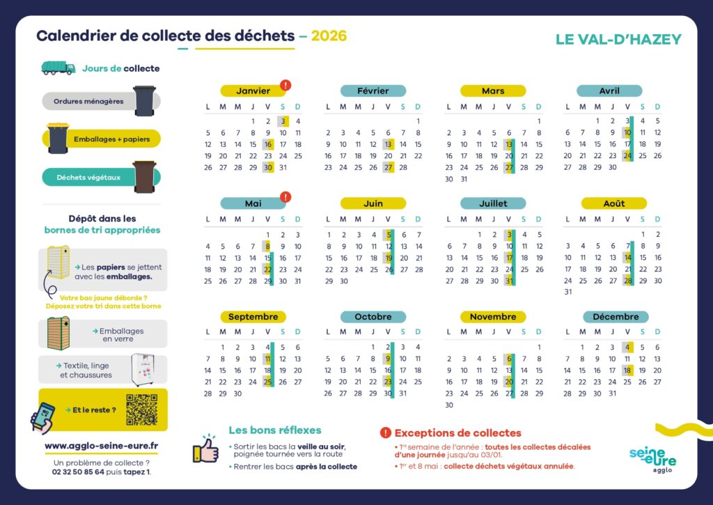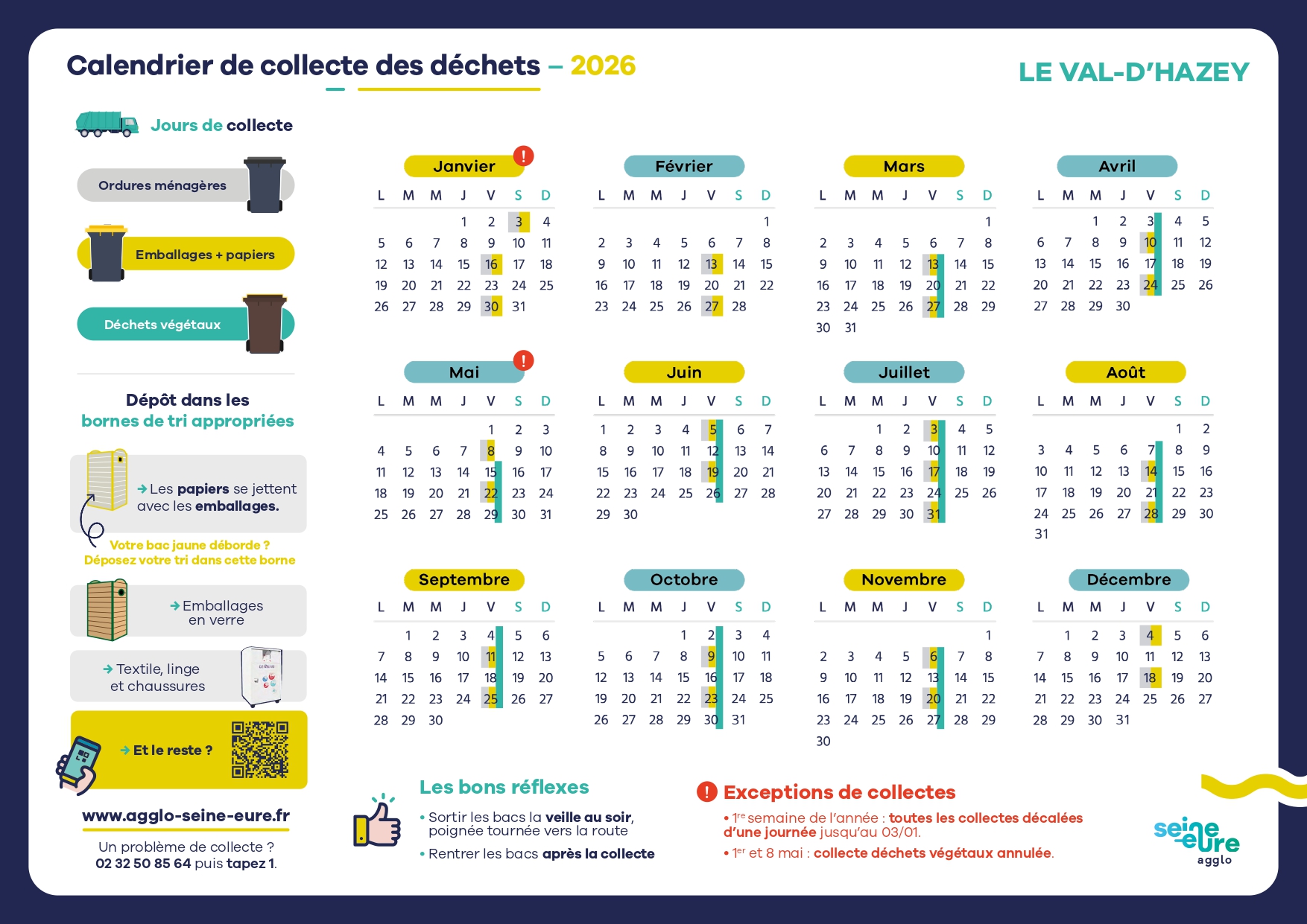 Le calendrier de collecte des déchets est disponible. Pensez à le consulter pour connaßtre les jours de sortie des bacs (ordures ménagÚres, tri sélectif, déchets verts)