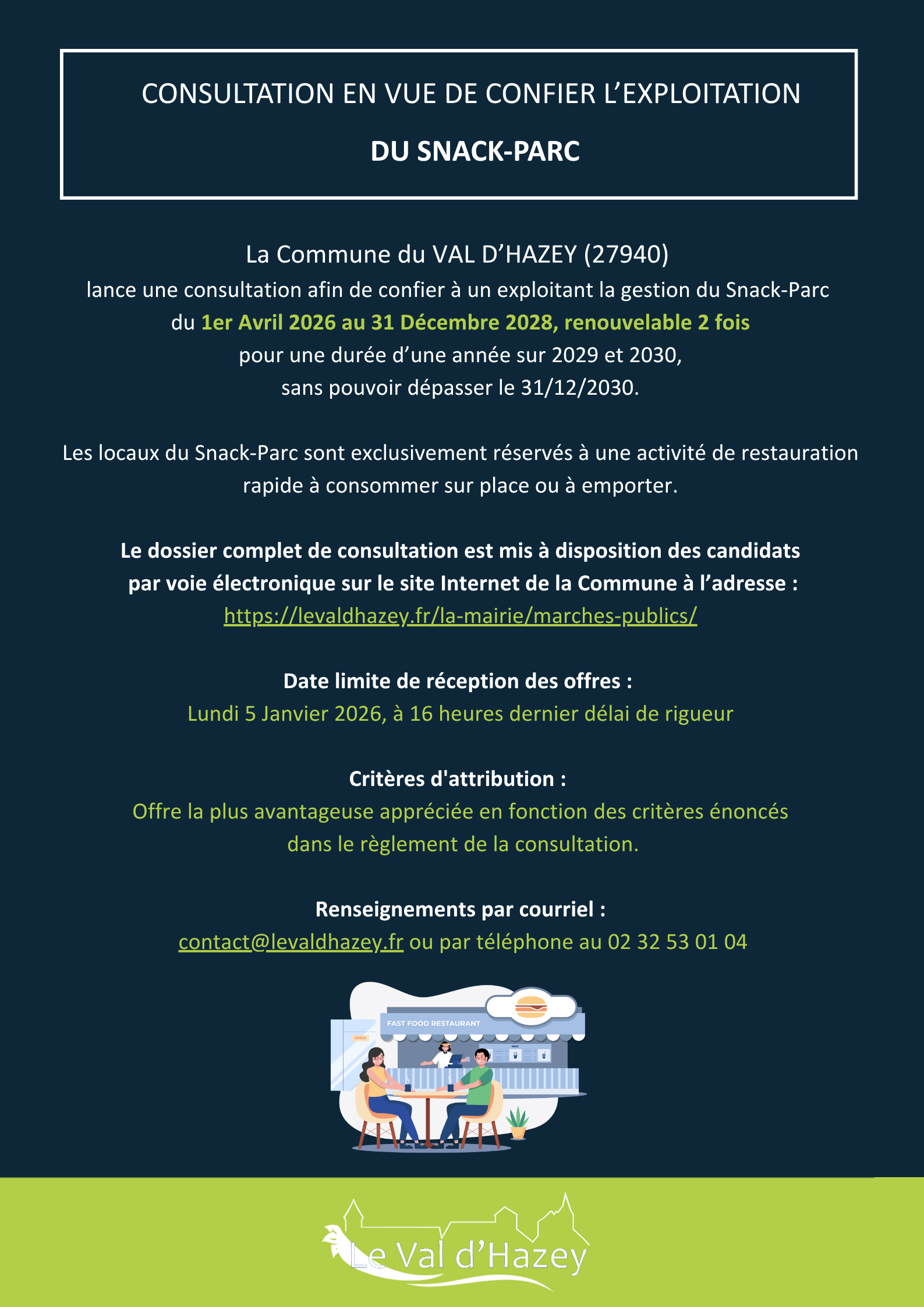 Marchés publics Accueil >La mairie>Marchés publics Mis à jour : 18 novembre 2025 Marchés publics en cours Pièces de la consultation : RC Snack-Parc AAPC – Snack-Parc Attestation de visite Snack-Parc Cahier des charges – Snack-Parc Projet AOT Liste des marchés passés par la collectivité Année 2024 Année 2023 Année 2022 Consultez les marchés de la commune sur https://marchespublics.eure.fr/ Contact en mairie : *protected email*